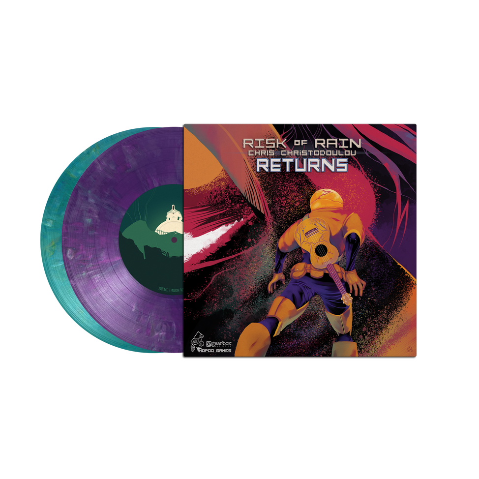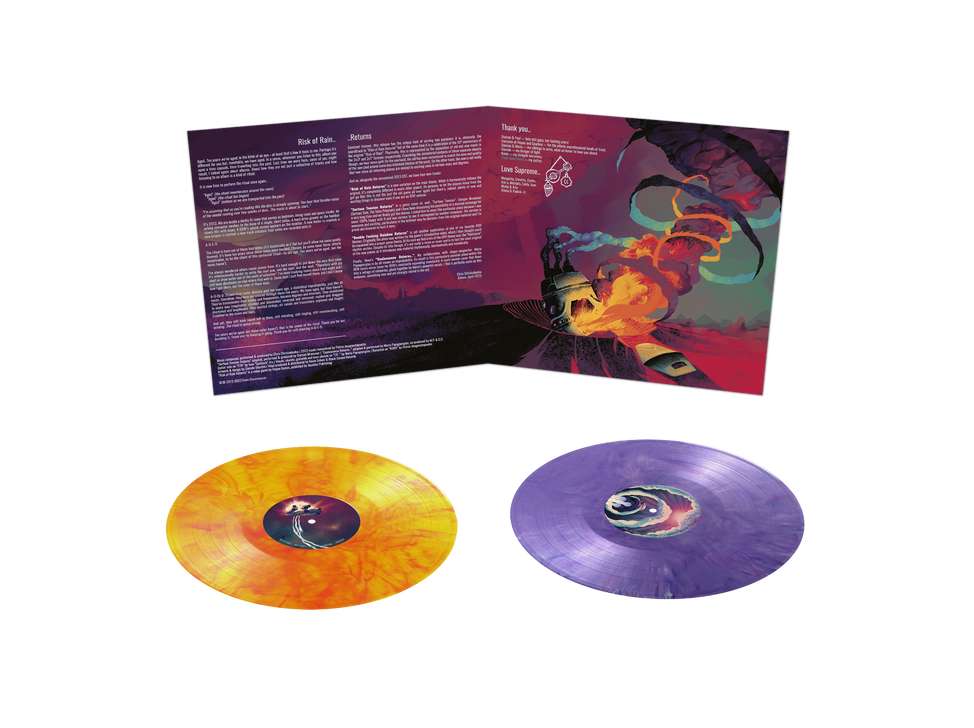 Double 180g coloured marbled vinyl (Disc 1: translucent sun yellow with red; Disc 2: purple with violet & white) housed in a gatefold cover. Double EP 7" on randomly coloured eco vinyl with four new tracks written for "Risk Of Rain Returns". Carefully designed, beautifully remastered and loaded with new ways to play - "Risk of Rain" is back and better than ever! Dive into the iconic roguelike full of unique loot combinations, enhanced with new Survivors, overhauled multiplayer, fan favourite content from Risk of Rain 2 and more! Ten years to the day, after "Risk of Rain" was released into the world to become a true classic, the game is revived on November 8, 2023 as "Risk of Rain Returns" to reconnect with its fans and be discovered by those who didn't realise what they were missing.